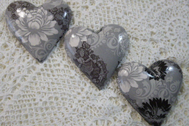 Set of 3 Grey and Black Floral Hearts
